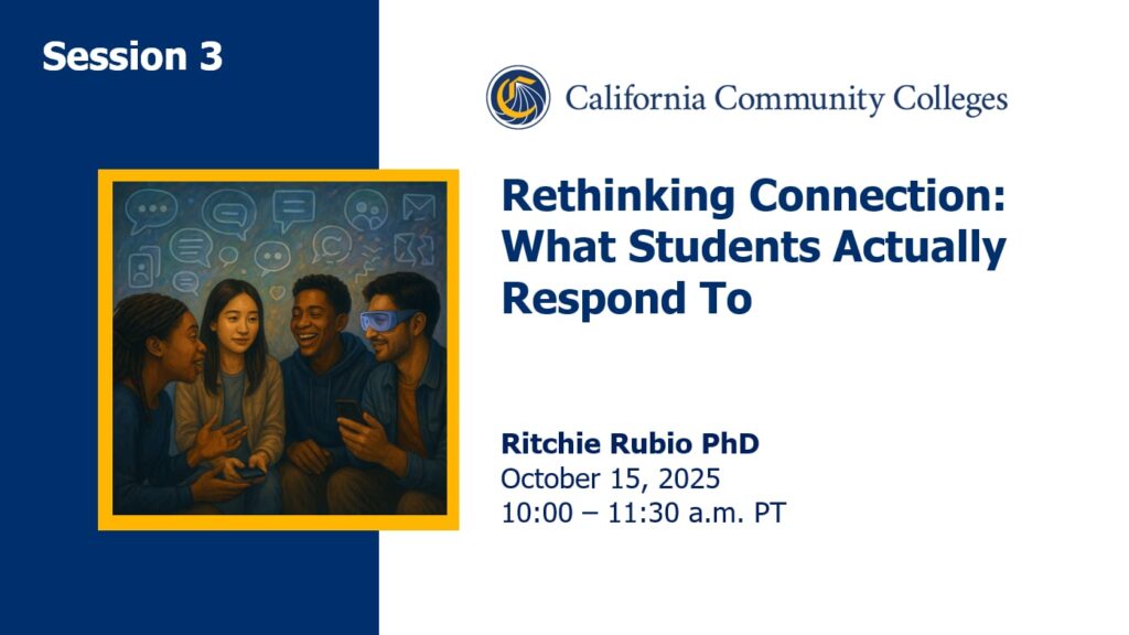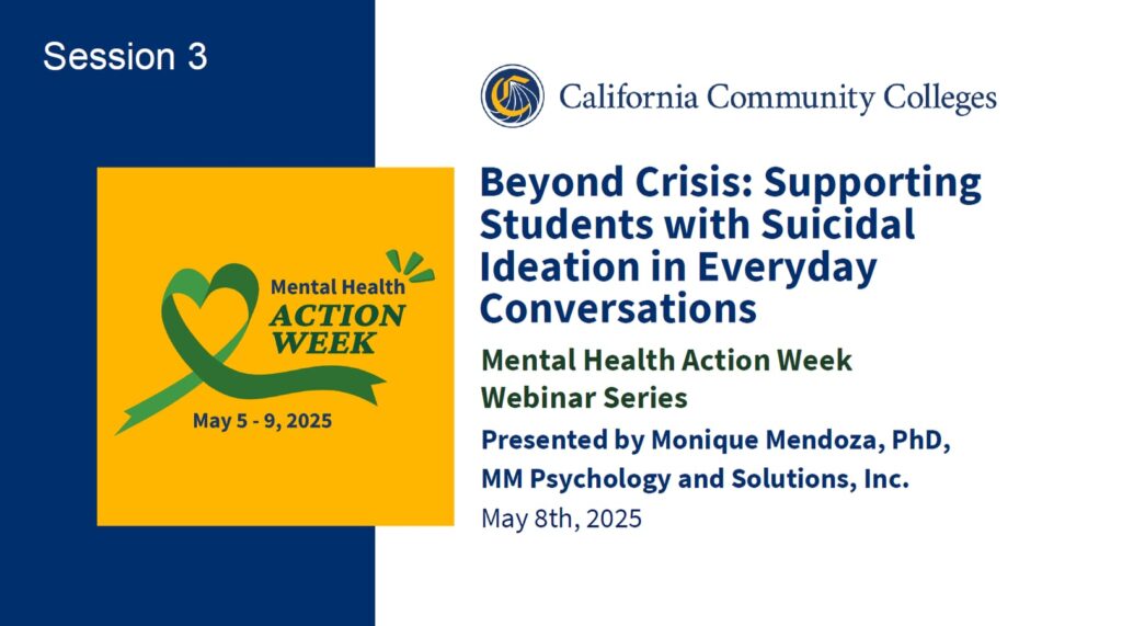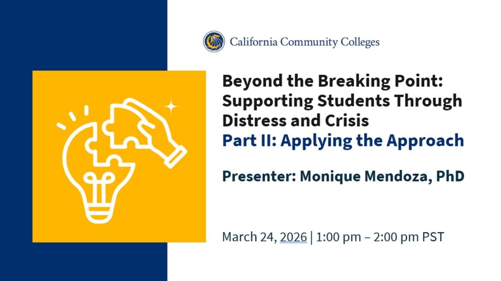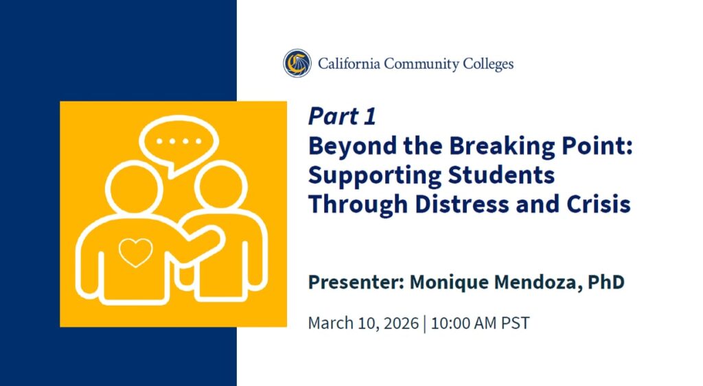 Quickly search our archive of recorded CCC Health & Wellness webinars to watch, revisit, and share sessions on student mental health, wellness, and basic needs.